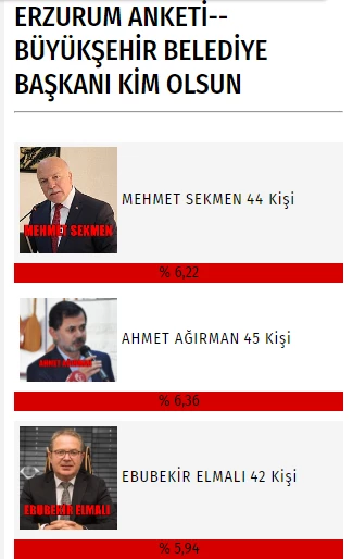 Erzurum halkının Büyükşehir Belediye Başkanı olarak görmek istediği Anketin başlatıldığı 08.12.2023 Cuma akşam 20.00 saat'den itibaren adaylar sıralamasında Fevzi Çakmak,Ali Korkut,Ahmet Ağırman ilk sıralarda olmayı başardı.