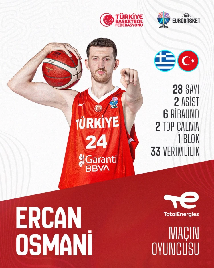 Milli basketbolcu Ercan Osmani, Yunanistan maçında kaydettiği 28 sayıyla galibiyette başrol üstlendi.