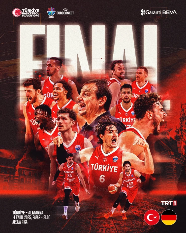 A Erkek Milli Basketbol Takımı, FIBA 2025 Avrupa Şampiyonası finalinde Almanya ile şampiyonluk için mücadele edecek. Maç, 14 Eylül 2025 Pazar günü saat 21.00’de Letonya’nın Riga kentindeki Arena Riga’da oynanacak ve TRT1’den canlı yayınlanacak.