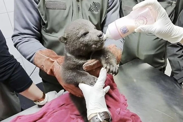 Yavru boz ayıya Ovakorusu Ayı Barınağı'ndaki ekipler, anne şefkatiyle yaklaşıyor ve besleme ile bakımına büyük özen gösteriyor.