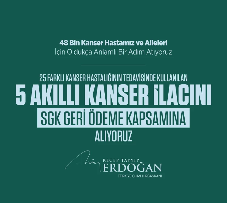 Cumhurbaşkanı Erdoğan, 25 farklı kanser hastalığının tedavisinde kullanılan 5 akıllı ilacın SGK geri ödeme kapsamına alındığını duyurdu, 48 bin hastaya umut olacak bu adımın önemine vurgu yaptı.
