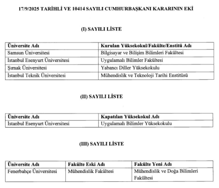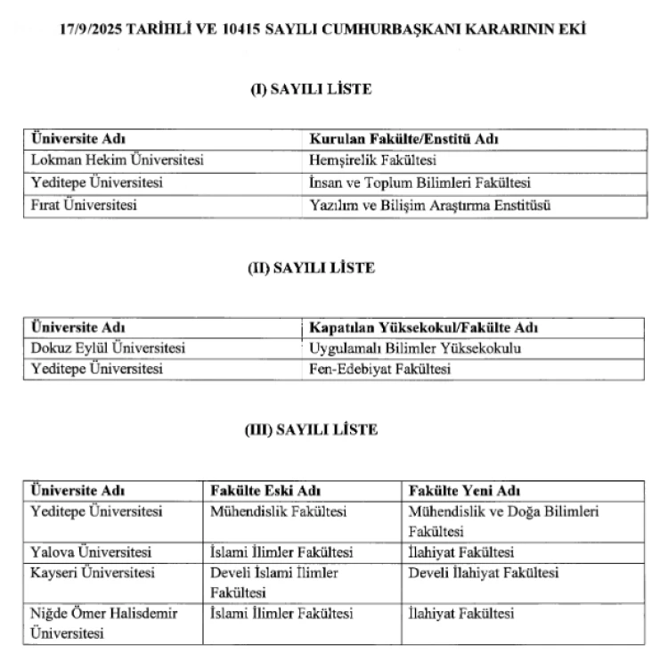 TRHABERTÜRK ANKARA - Cumhurbaşkanlığı Kararı ile Türkiye genelinde bazı üniversitelerde yeni fakülte, enstitü ve yüksekokullar kuruldu, bazı birimler kapatıldı, fakülte isimleri değiştirildi. Kararlar, bugünkü Resmi Gazete’de yayımlanarak yürürlüğe girdi.