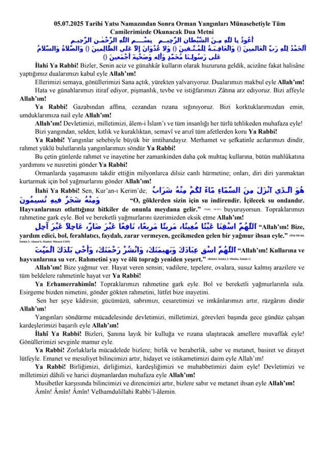 Ülkemizde meydana gelen Orman yangınlarına karşı 05.07.2025 (bu akşam) yatsı namazından sonra tüm camilerde okunacak Dua metnini yayımladı.