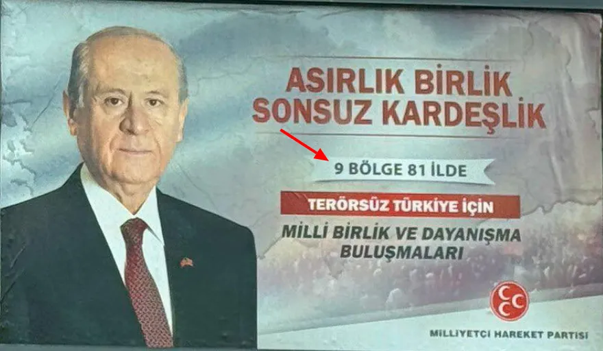 MHP Genel Başkanı Devlet Bahçeli'nin öncülüğünde başlatılan “Terörsüz Türkiye için Milli Birlik ve Dayanışma Buluşmaları” kapsamında düzenlenecek mitingler için hazırlanan propaganda afişleri, Ankara’daki reklam panolarında yerini aldı. Ancak afişte kullanılan “9 bölge 81 il” ifadesi, sosyal medyada tepkiyle karşılandı.
