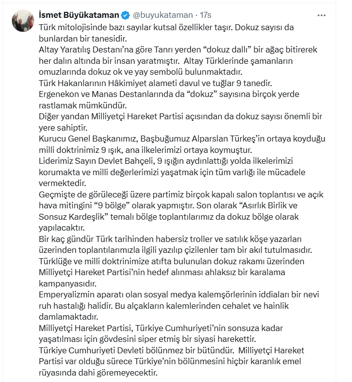 MHP Genel Sekreteri Bursa Milletvekili İsmet Büyükataman, tartışmalara neden olan "9 bölge" ifadesine ilişkin detaylı bir açıklama yaparak, sayının Türk tarihindeki ve partinin kurumsal yapısındaki sembolik önemine işaret etti. Büyükataman, yaptığı açıklamada "Türk mitolojisinde bazı sayılar kutsal özellikler taşır. Dokuz sayısı da bunlardan biridir. MHP açısından da dokuz sayısı çok anlamlıdır. Kurucu liderimiz Alparslan Türkeş'in ortaya koyduğu milli doktrin 9 Işık'tır. Sayın Bahçeli, bu ilkeler doğrultusunda mücadele vermektedir" ifadelerine yer verdi.