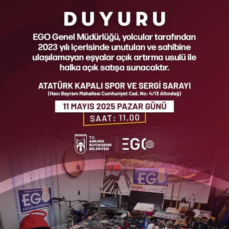 Ankara Elektrik, Havagazı ve Otobüs İşletme Müessesesi EGO Genel Müdürlüğü, il genelindeki ulaşım araçlarında 2023 yılında unutulan eşyaları açık artırmayla satışa çıkarıyor.