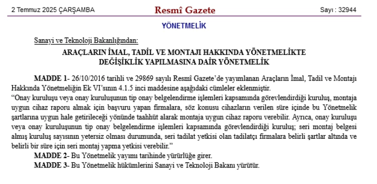 Buna göre yönetmeliğin Ek VI’sının 4.1.5 maddesine eklenen hükümlerle, onay kuruluşları veya tip onay belgelendirme işlemleri için görevlendirilen kuruluşlar, montaja uygun cihaz raporu için başvuran firmalara, cihazların belirlenen süre içinde yönetmelik şartlarına uygun hale getirileceği taahhüdüyle rapor verebilecek. Ayrıca, seri montaj belgesi alan kuruluş sayısının yetersiz olması durumunda, onay kuruluşları, seri tadilat yetkisine sahip firmalara belirli şartlar ve süre sınırı ile seri montaj yetkisi sağlayabilecek.