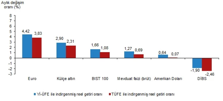 Yİ-ÜFE ile indirgendiğinde; yatırım araçlarından külçe altın yüzde 2,90, BIST 100 endeksi yüzde 1,66, mevduat faizi (brüt) yüzde 1,27 ve Amerikan Doları yüzde 0,64 oranlarında yatırımcısına reel getiri sağlarken; Devlet İç Borçlanma Senetleri (DİBS) yüzde 1,90 oranında yatırımcısına kaybettirdi. TÜFE ile indirgendiğinde; yatırım araçlarından külçe altın yüzde 2,31, BIST 100 endeksi yüzde 1,08, mevduat faizi (brüt) yüzde 0,69 ve Amerikan Doları yüzde 0,07 oranlarında yatırımcısına reel getiri sağlarken; DİBS yüzde 2,46 oranında yatırımcısına kaybettirdi.