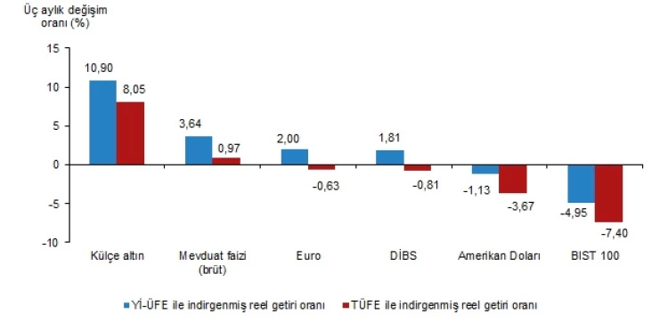 Külçe altın, üç aylık değerlendirmede; Yİ-ÜFE ile indirgendiğinde yüzde 10,90, TÜFE ile indirgendiğinde ise yüzde 8,05 oranlarında yatırımcısına en yüksek reel getiri sağlayan yatırım aracı oldu. Aynı dönemde BIST 100 endeksi, Yİ-ÜFE ile indirgendiğinde yüzde 4,95, TÜFE ile indirgendiğinde ise yüzde 7,40 oranlarında yatırımcısına en çok kaybettiren yatırım aracı oldu.