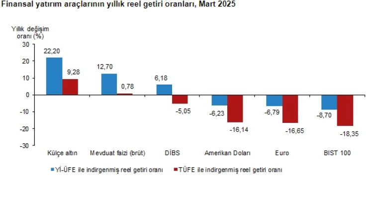Finansal yatırım araçları yıllık olarak değerlendirildiğinde külçe altın; Yİ-ÜFE ile indirgendiğinde yüzde 22,20, TÜFE ile indirgendiğinde ise yüzde 9,28 oranlarında yatırımcısına en yüksek reel getiri sağlayan yatırım aracı oldu.
