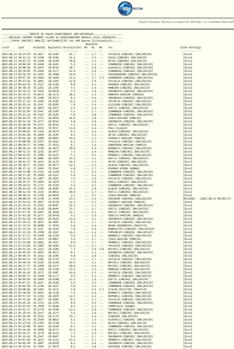 Kandilli Rasathanesi Ve Deprem Araştırma Enstitüsü’nün resmi internet sitesinde yayınlanan son depremlerde, son 3 günde sadece Balıkesir ve Manisa’da meydana gelen depremlerin olması korkutuyor.
