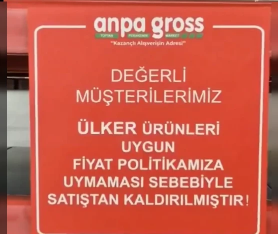 Anpa Gross isimli zincir marketler " Ülker Ürünleri uygun fiyat politikamıza uymaması sebebiyle satıştan kaldırılmıştır" diyerek Ülker marka ürünlerin satışı yapılan reyonlara bu bilgi notu asıldı.