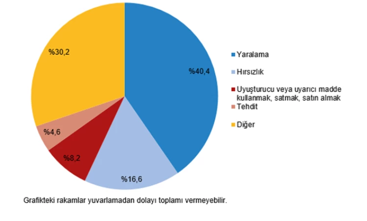 Suça sürüklenme iddiasıyla güvenlik birimlerine gelen 202 bin 785 çocuğun isnat edilen suçları ise şöyle:yüzde 40,4’üne yaralama, yüzde 16,6’sına hırsızlık, yüzde 8,2’sine uyuşturucu veya uyarıcı madde kullanmak, satmak veya satın almak, yüzde 4,6’sına tehdit, yüzde 4,2’sine genel tehlike oluşturan suçlar, yüzde 26,0’sına diğer suçlar isnat edildi.