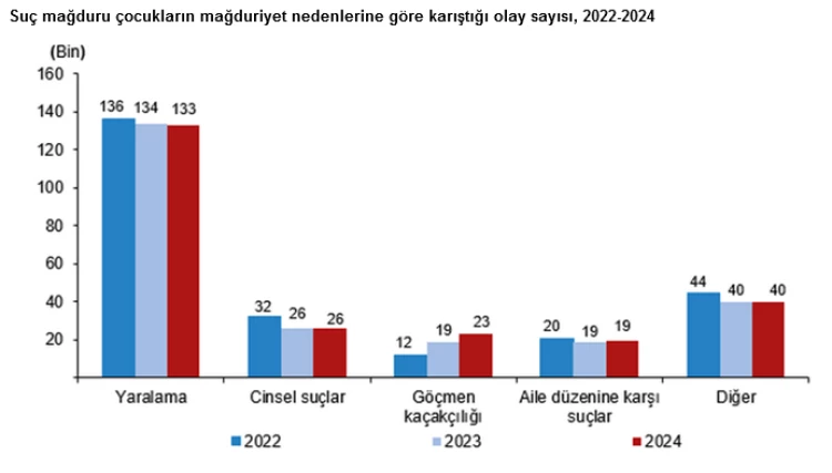 Suç mağduru çocukların dağılımınde ise, yüzde 55,3’ü yaralama, yüzde 10,8’i cinsel suçlar, yüzde 9,5’i göçmen kaçakçılığı, yüzde 8,0’i aile düzenine karşı suçlar, yüzde 16,5’i diğer nedenlerden dolayı mağdur oldu.