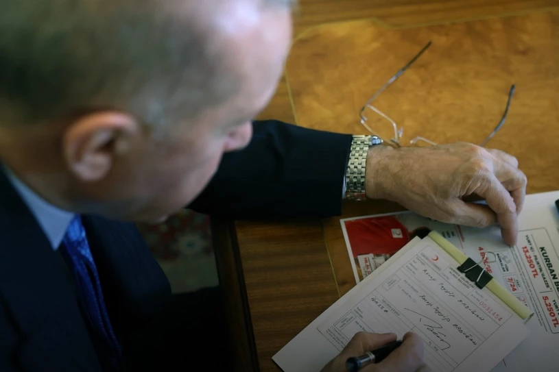 Türk Kızılay'ın çalışmaları hakkında bilgi alan Cumhurbaşkanı Erdoğan, kurban bağışını Gazze'de kesilmek üzere Türk Kızılay'a yaptı.