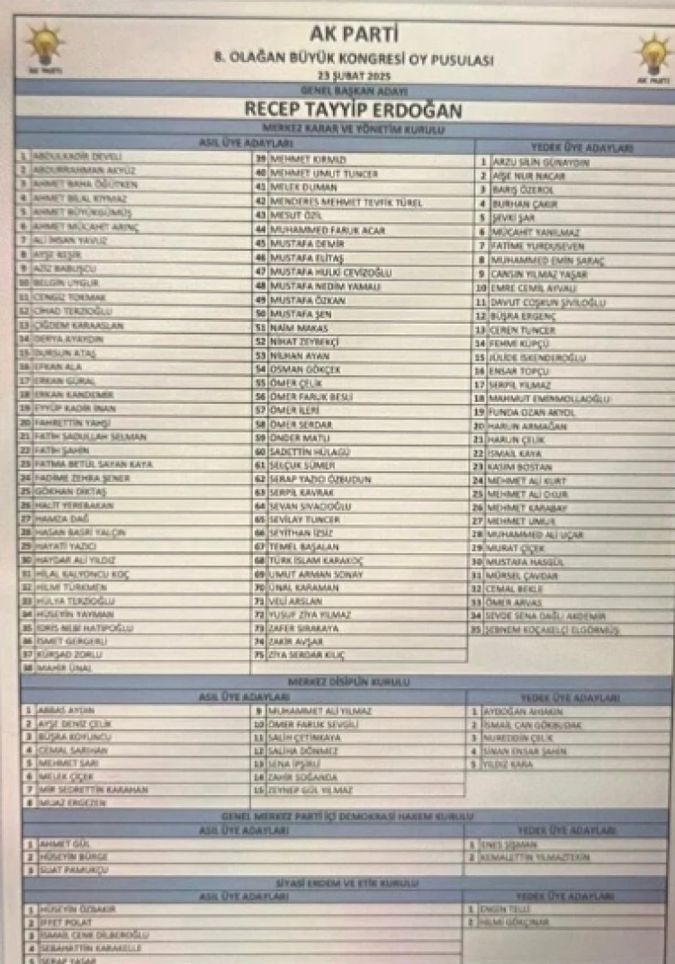 AK Parti'nin 8. Olağan Büyük Kongresi'nde oluşturulan yeni listeye göre asil üyeler şu isimlerden oluştu: