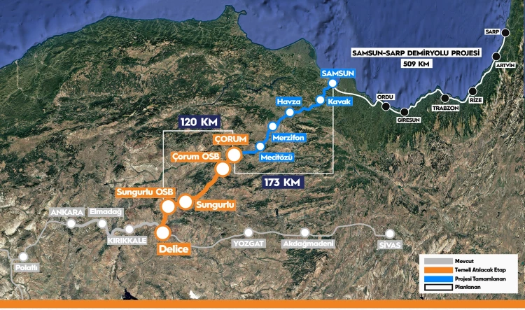 Ankara-Kırıkkale-Çorum-Samsun Hızlı Demir Yolu Projesi’nin Delice-Çorum etabının temelinin atıldığını duyuran Cumhurbaşkanı Erdoğan, "Hat, yılda 12 milyon yolcu ve 14 milyon ton yük taşıyacak, Samsun ve Mersin limanlarını birleştirecek. Saatte 200 km hıza uygun planlanan projeyle Çorum-Ankara arası 1 saat 15 dakikaya, Ankara-Samsun arası ise 2029’da tamamlandığında 2,5 saate inecek. 5 istasyon, 8 tünel, 26 köprü ve viyadük ile 16 üst geçitten oluşacak hat, İstanbul ve Çanakkale Boğazları’ndaki yük trafiğini hafifletecek ve Türkiye’yi küresel ticaretin lojistik merkezi yapacak" diye konuştu.