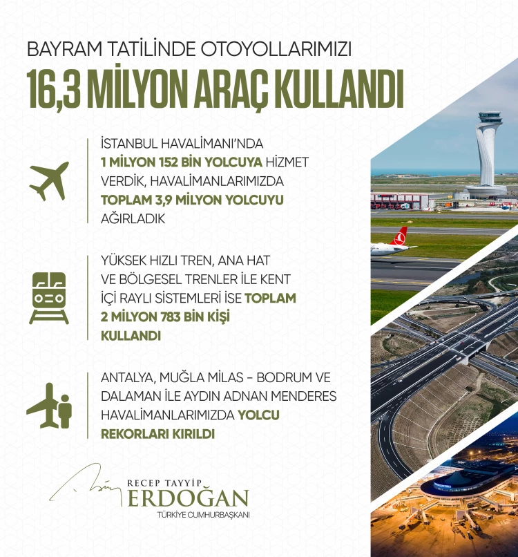 4-9 Haziran’da otoyollardan 16,3 milyon araç geçtiğini, İstanbul Havalimanı’nda 1,15 milyon yolcuya hizmet verildiğini, havalimanlarında toplam 3,9 milyon yolcunun ağırlandığını belirten Erdoğan, Antalya, Muğla ve Aydın havalimanlarında yolcu rekorları kırıldığını kaydetti.