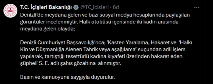 TRHABERTÜRK ANKARA- Denizli’de bir halk otobüsünde yaşanan ve sosyal medyada geniş yankı bulan olayda, tesettürlü bir kadına yönelik hakaret ve tartışma olayıyla ilgili İçişleri Bakanlığı açıklama yaptı. Bakanlık, Denizli Cumhuriyet Başsavcılığı’nın harekete geçtiğini ve şüpheli S.E.’nin gözaltına alındığını duyurdu.