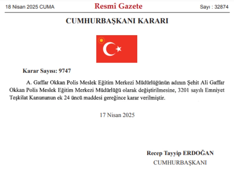 Cumhurbaşkanı kararı ile Diyarbakır’daki A. Gaffar Okkan Polis Meslek Eğitim Merkezi Müdürlüğü’nün adı 'Şehit Ali Gaffar Okkan Polis Meslek Eğitim Merkezi Müdürlüğü' olarak değiştirildi.