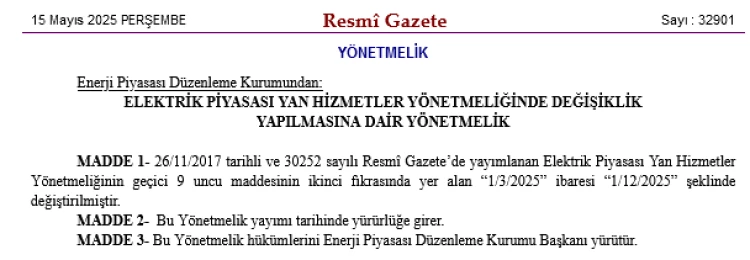 Enerji Piyasası Düzenleme Kurumu (EPDK), EPDK, Elektrik Piyasası Yan Hizmetler Yönetmeliği’nde değişiklik yaparak, maddenin uygulama tarihini 1 Mart 2025’ten 1 Aralık 2025’e erteledi.