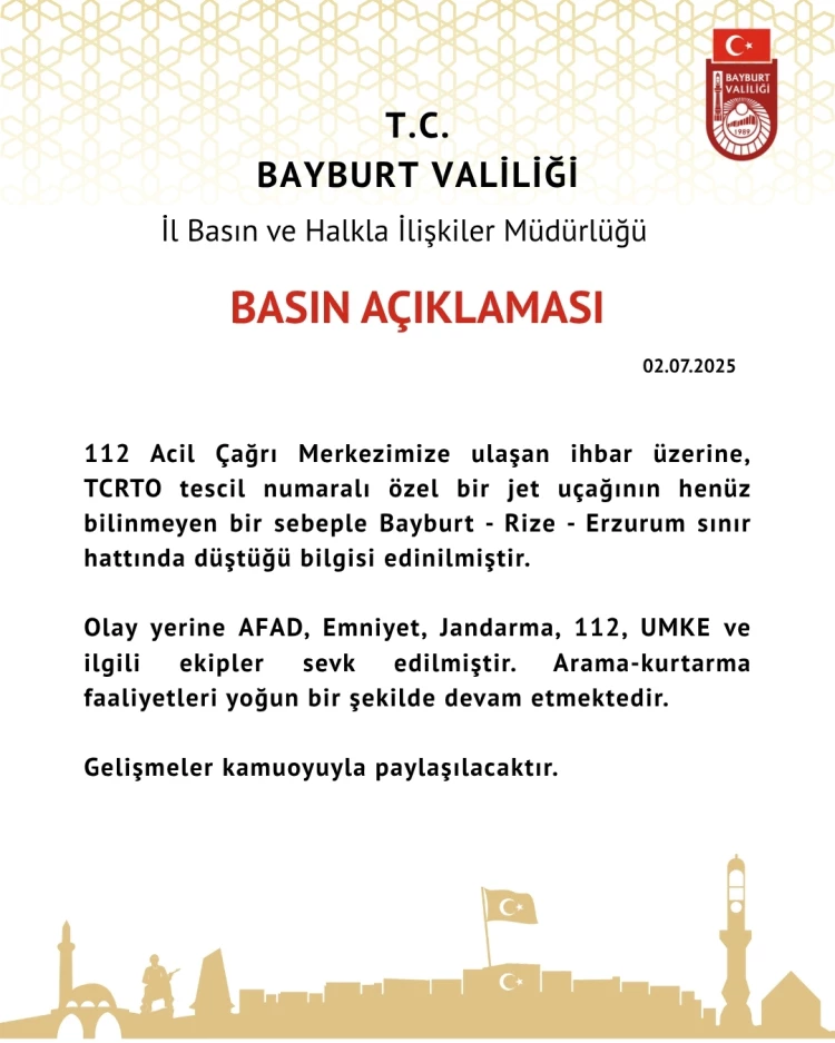 Öte yandan Bayburt Valiliği'nden de konuyla ilgili yazılı açıklama geldi.