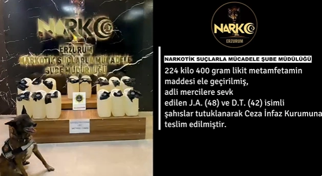 Narkotik Suçlarla Mücadele Şube Müdürlüğü ekipleri, İstihbarat Şube Müdürlüğü ve NMAK (Narkotik Madde Arama Köpeği) MAGNUM ile birlikte gerçekleştirdiği operasyonda, toplam 224 kilo 400 gram likit metamfetamin ele geçirdi. Çok yönlü teknik takip, analiz ve istihbari çalışmalar sonucu yakalanan J.A. (48) ve D.T. (42) isimli şüpheliler, çıkarıldıkları adli mercilerce tutuklanarak Ceza İnfaz Kurumuna teslim edildi.