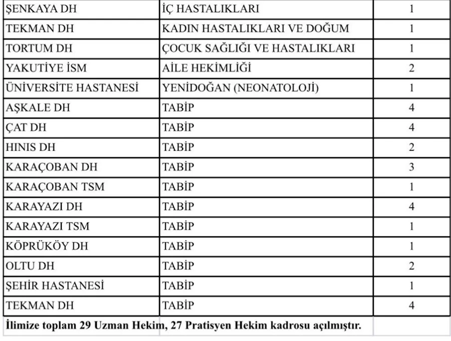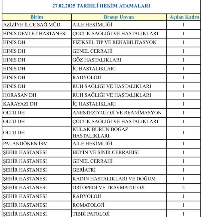 Aziziye, Hınıs, Horasan, Karayazı, Oltu, Palandöken, Şenkaya, Tekman, Tortum, Yakutiye ve birçok ilçemizde aile hekimliği, çocuk sağlığı, genel cerrahi, radyoloji, ruh sağlığı, kadın hastalıkları ve doğum gibi kritik branşlarda atamalar gerçekleştirilmiştir.