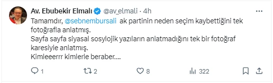 Ünlü Avukat Elmalı, Bursalı’nın yaptığı paylaşımı eleştirerek, Tamamdır, Şebnem Bursalı AK Partinin neden seçim kaybettiğini tek fotoğrafla anlatmış. Sayfa sayfa siyasal sosylojik yazıların anlatmadığını tek bir fotoğraf karesiyle anlatmış. Kimleeerrr kimlerle beraber…. dedi.