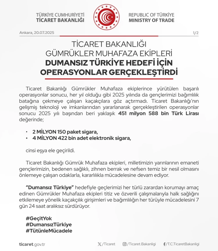 Ticaret Bakanlığı Gümrük Muhafaza ekipleri, 2025’te “Dumansız Türkiye” hedefiyle gerçekleştirdiği operasyonlarda 2 milyon 150 bin paket sigara ve 4 milyon 422 bin adet elektronik sigara yakaladı.