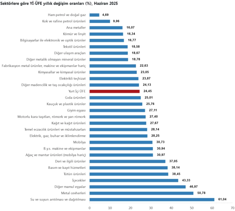 TÜİK verilerine göre, Haziran 2025’te Yurt İçi Üretici Fiyat Endeksi (Yİ-ÜFE) yıllık yüzde 24,45, aylık yüzde 2,46 artarken, imalat ürünlerinde yıllık yüzde 23,79, aylık yüzde 1,84 artış kaydedildi. Su temininde yüzde 61,04 artış gözlendi.