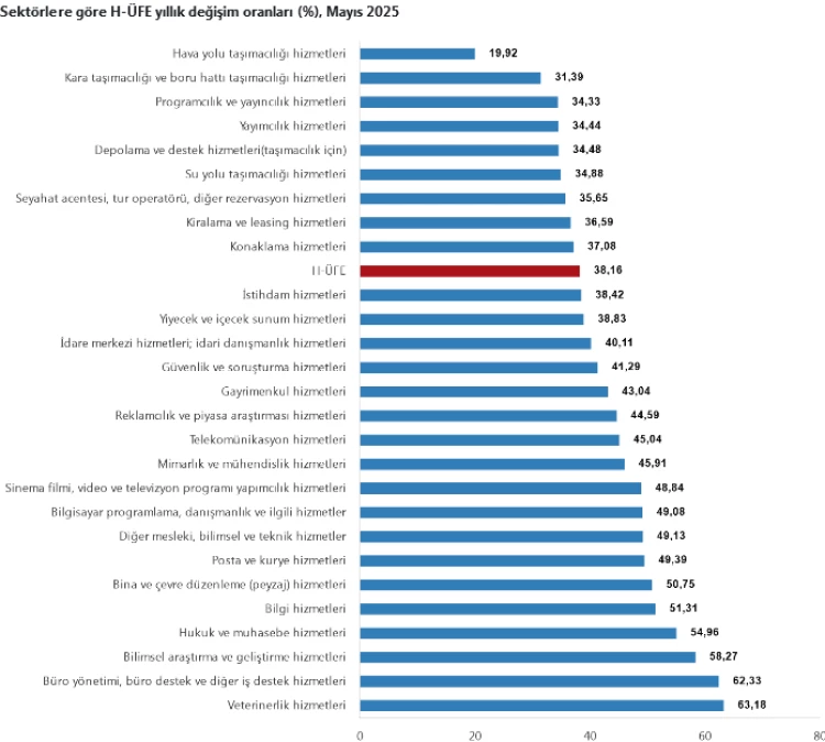 TÜİK verilerine göre, H-ÜFE 2025 Mayıs’ta bir önceki aya göre yüzde 2,37, bir önceki yıla göre yüzde 38,16 yükseldi. Ulaştırma ve depolama hizmetlerinde yıllık artış yüzde 31,33 oldu.