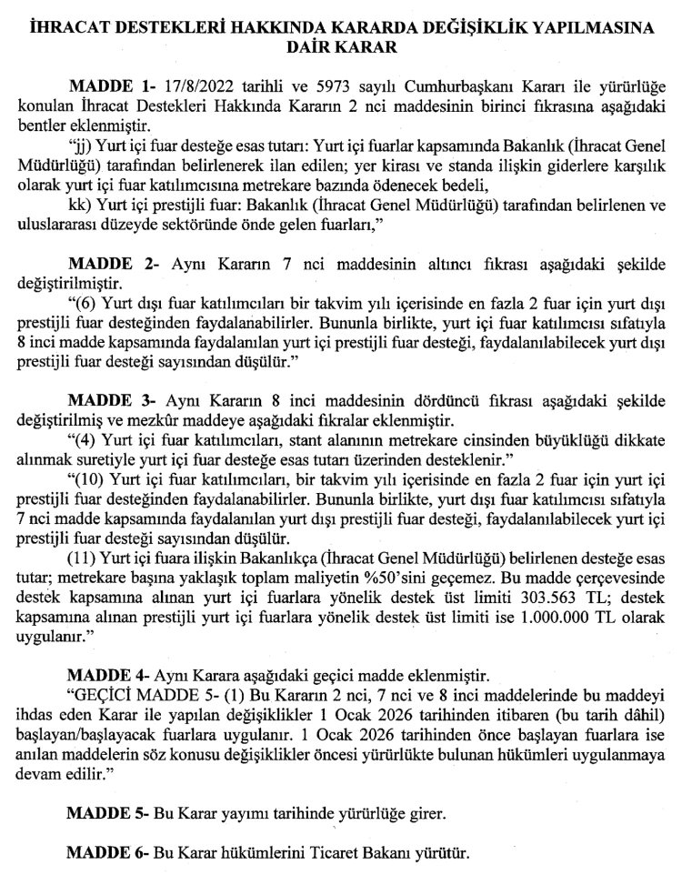 Ayrıca, 1 Ocak 2026’dan itibaren başlayacak fuarlara uygulanacak değişiklikler, fuar destek limitlerini ve koşullarını kapsıyor. Söz konusu değişiklik kararına göre bu tarihten önce başlayan fuarlara ise mevcut hükümler geçerli olacak.