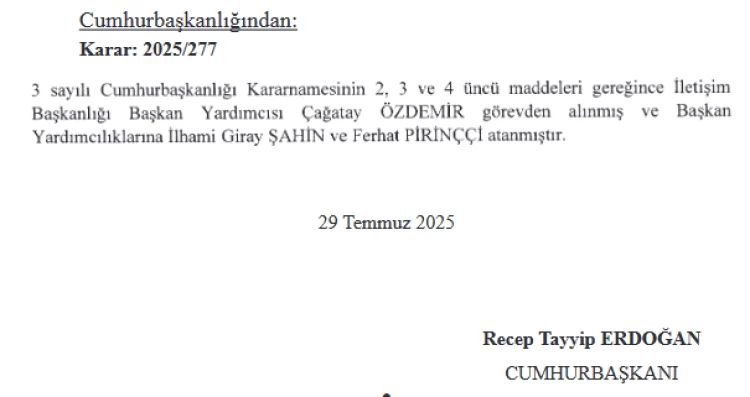 Cumhurbaşkanı Erdoğan’ın imzasıyla Resmi Gazete’de yayımlanan kararla, İletişim Başkanlığı Başkan Yardımcısı Çağatay Özdemir görevden alınırken, İlhami Giray Şahin ve Ferhat Pirinççi yeni başkan yardımcıları olarak atandı.