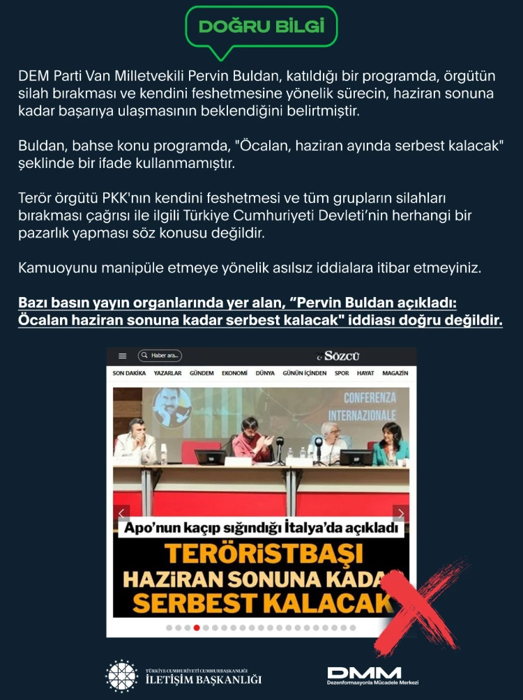 Dezenformasyonla Mücadele Merkezi'nden yapılan açıklamada, "DEM Parti Van Milletvekili Pervin Buldan, katıldığı bir programda, örgütün silah bırakması ve kendini feshetmesine yönelik sürecin, haziran sonuna kadar başarıya ulaşmasının beklendiğini belirtmiştir. Buldan, bahse konu programda, "Öcalan, haziran ayında serbest kalacak" şeklinde bir ifade kullanmamıştır. Terör örgütü PKK'nın kendini feshetmesi ve tüm grupların silahları bırakması çağrısı ile ilgili Türkiye Cumhuriyeti Devleti’nin herhangi bir pazarlık yapması söz konusu değildir. Kamuoyunu manipüle etmeye yönelik asılsız iddialara itibar etmeyiniz" ifadeleri yer aldı.