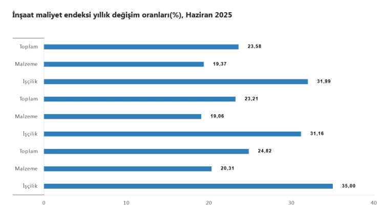 TÜİK’in yayımladığı verilere göre, inşaat maliyet endeksi 2025 yılı Haziran ayında bir önceki aya kıyasla yüzde 1,37, geçen yılın aynı ayına göre yüzde 23,58 yükseldi.