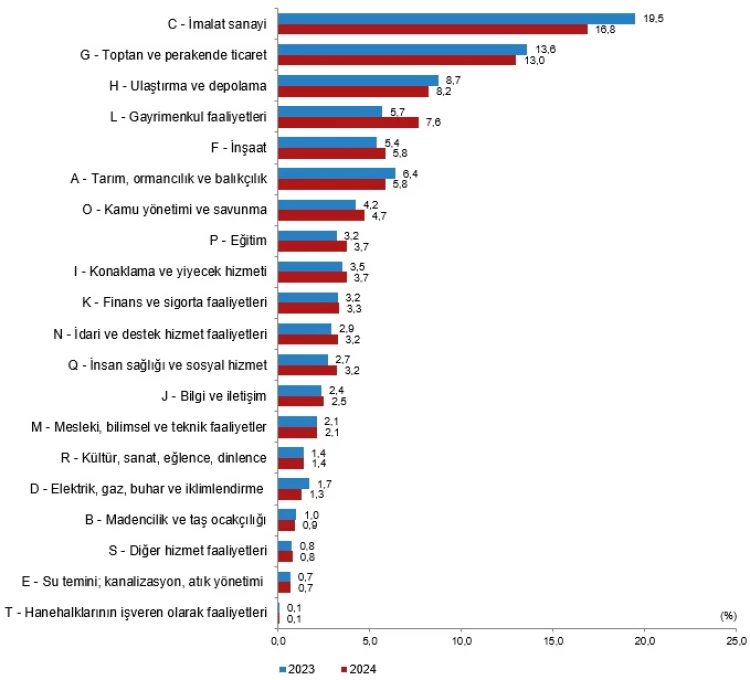 Sektörel bazda, inşaat yüzde 9,9 ile en yüksek büyümeyi gösterirken, su temini, kanalizasyon ve atık yönetimi yüzde 6,5, toptan ve perakende ticaret yüzde 6,2 artışla öne çıktı. Buna karşılık, hanehalklarının işveren faaliyetleri yüzde 0,8, imalat sanayi yüzde 0,5 ve ulaştırma-depolama yüzde 0,5 daraldı.