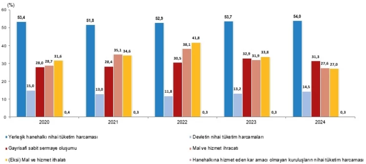 Yerleşik hanehalkı nihai tüketim harcamaları yüzde 4,3 artarak GSYH içindeki payını yüzde 54’e taşıdı. En yüksek harcama kalemleri yüzde 21,7 ile gıda ve alkolsüz içecekler, yüzde 15,9 ile ulaştırma ve konut giderleri oldu. Devletin nihai tüketim harcamaları yüzde 0,8 azalırken, gayrisafi sabit sermaye oluşumu yüzde 2,7 artışla GSYH’de yüzde 31,3 pay aldı.