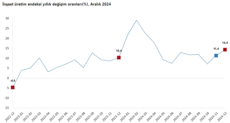 İnşaat üretim endeks verileri Aralık 2024'te yıllık bazda yüzde 14,4 arttı.