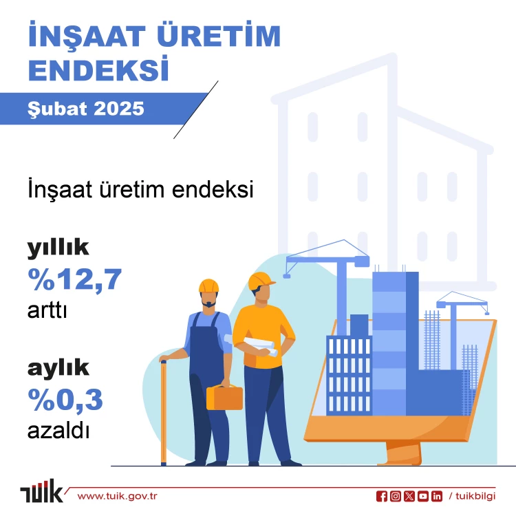 Şubat ayına ilişkin İnşaat Üretim Endeksi verilerini açıklayan TÜİK'e göre, inşaat üretimi yıllık yüzde 12,7 artarken, aylık bazda yüzde 0,3 oranında azaldı.