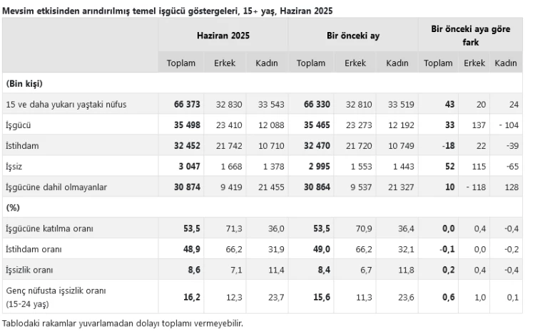 Türkiye’de mevsim etkisinden arındırılmış işsizlik oranı Haziran’da yüzde 8,6’ya çıkarken, istihdam oranı yüzde 48,9, atıl işgücü oranı ise yüzde 32,9 olarak gerçekleşti; genç işsizlik yüzde 16,2 oldu.