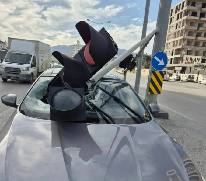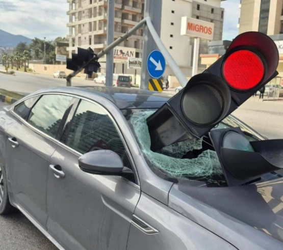 Edinilen bilgilere göre, henüz bilinmeyen bir nedenle devrilen direğe bağlı trafik ışıkları aracın ön camını kırarak içeri girdi. Araçta bulunanlar, camdan içeri giren trafik ışıklarının milim farkıyla kendilerine isabet etmemesi sayesinde yara almadan kurtuldu.