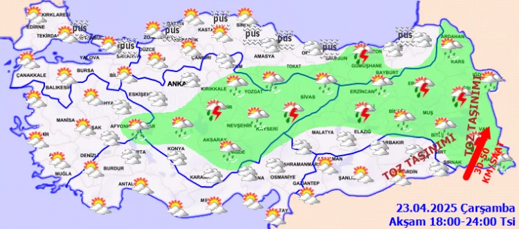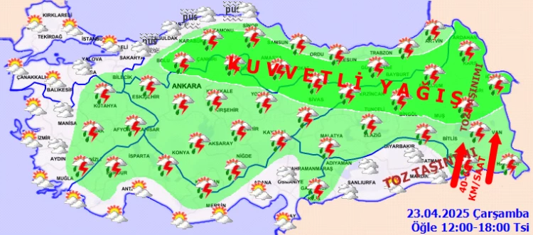 Yağışların, Karadeniz’in iç kesimleri, Doğu Anadolu’nun kuzey ve doğusu ile Çankırı ve Sivas çevrelerinde yerel olmak üzere kuvvetli olması bekleniyor. Marmara'nın kuzeyi ile Karadeniz kıyılarında pus ve yer yer sis görüleceği tahmin ediliyor. Doğu Anadolu’nun doğusu ile Güneydoğu Anadolu’nun doğusunda toz taşınımı bekleniyor.