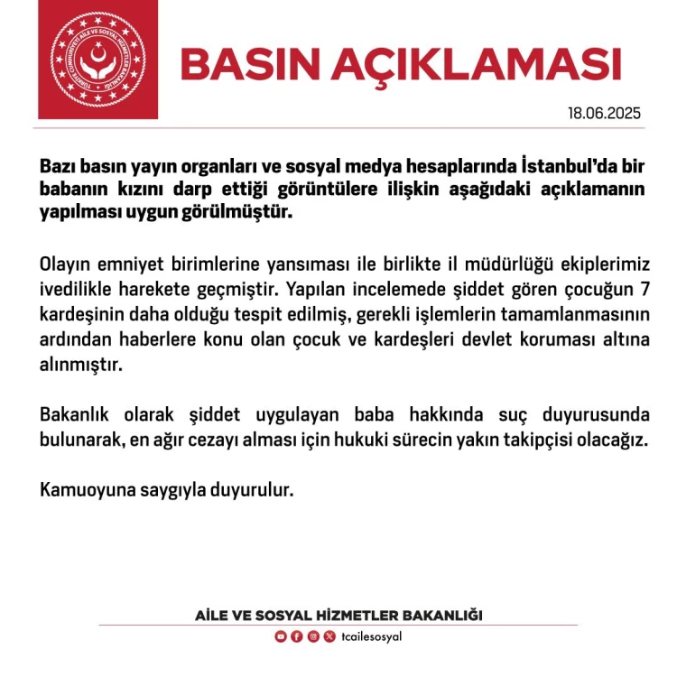 İstanbul’da bir babanın kızını darp ettiği görüntülerin ortaya çıkmasının ardından Aile ve Sosyal Hizmetler Bakanlığı, çocuğu ve 7 kardeşini devlet korumasına aldı, baba hakkında suç duyurusunda bulundu.