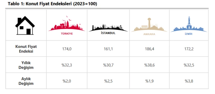İstanbul, Ankara ve İzmir’in konut fiyat endekslerindeki gelişmeler değerlendirildiğinde, 2025 yılı Mart ayında bir önceki aya göre, sırasıyla yüzde 2,5, 1,9 ve 3,8 oranlarında artış gözlenirken, endeks değerleri bir önceki yılın aynı ayına göre, İstanbul, Ankara ve İzmir’de sırasıyla yüzde 30,7, 38,6 ve 32,5 oranlarında artış gösterdi.