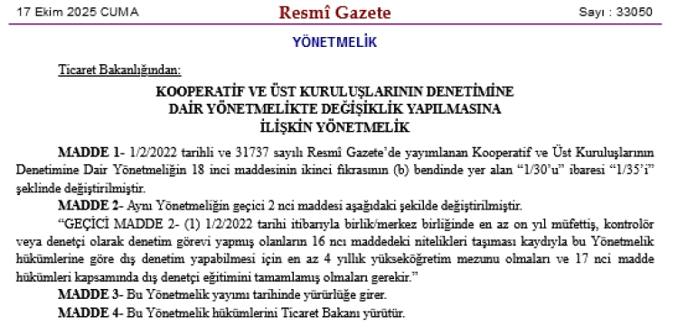 TRHT ANKARA - Ticaret Bakanlığı, kooperatif ve üst kuruluşlarının denetimine ilişkin usul ve esasları düzenleyen yönetmelikte değişiklik yaptı.