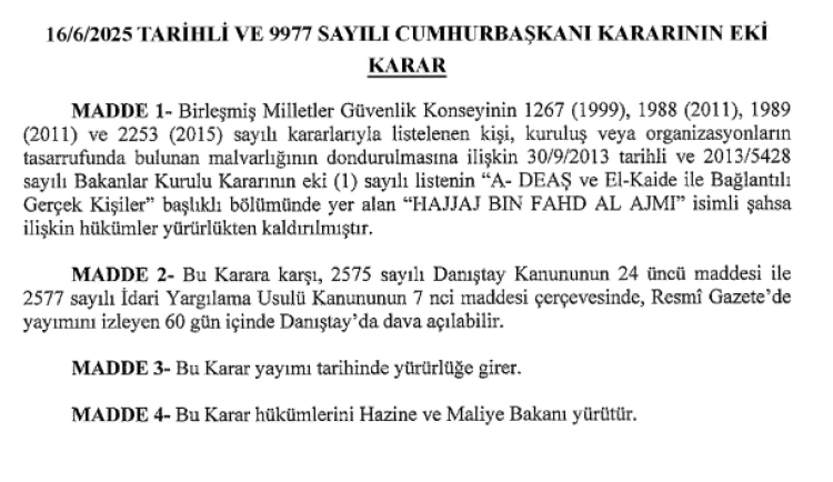TRHABERTÜRK ANKARA - Resmi Gazete’nin 17 Haziran 2025 tarihli sayısında, Birleşmiş Milletler Güvenlik Konseyi’nin 1267 (1999), 1988 (2011), 1989 (2011) ve 2253 (2015) sayılı kararlarıyla listelenen kişi, kuruluş veya organizasyonların malvarlığının dondurulmasına ilişkin 30 Eylül 2013 tarihli ve 2013/5428 sayılı Bakanlar Kurulu Kararı’nın ek (1) sayılı listesinde değişiklik yapıldı.