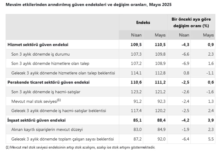 Türkiye İstatistik Kurumu (TÜİK), Mayıs 2025 güven endekslerini açıkladı. Hizmet sektöründe yüzde 0,9, perakende ticarette yüzde 0,6, inşaat sektöründe ise yüzde 3,9 artış kaydedildi.