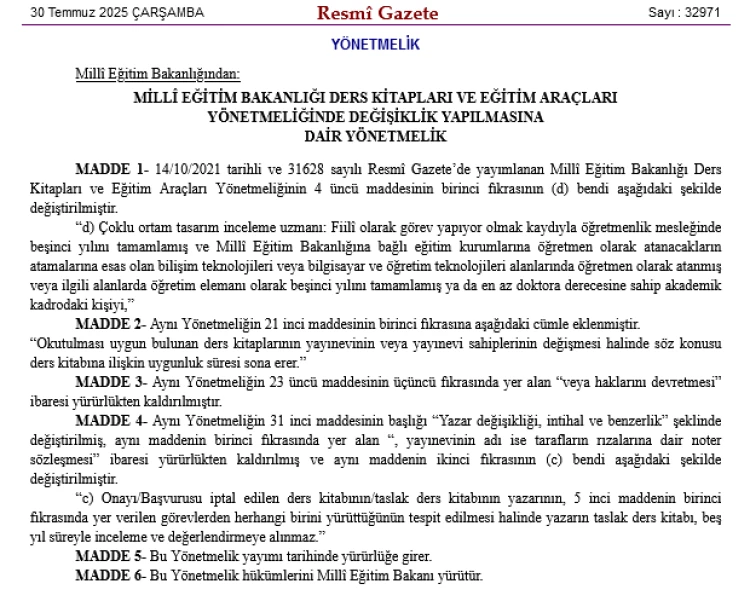 30 Temmuz 2025 tarihli Resmi Gazete’de yayımlanan yönetmelikle, Milli Eğitim Bakanlığı Ders Kitapları ve Eğitim Araçları Yönetmeliği’nde çoklu ortam uzmanı tanımı, yayınevi değişiklikleri ve yazar intihali gibi konularda düzenlemeler yapıldı