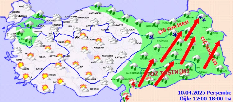 Yağışların yağmur ve sağanak, Güney kesimlerde yer yer gök gürültülü sağanak, Batı Karadeniz'in iç kesimleri, İç Anadolu'nun doğusu, Doğu Anadolu'nun kuzeydoğusu ile Bilecik, Kütahya, Eskişehir ve Ankara çevrelerinde karla karışık yağmur ve kar şeklinde görülmesi beklenen yağışların gece saatlerinden sonra Batı Karadeniz ile Sakarya çevrelerinde yerel kuvvetli olması bekleniyor. Rüzgarın, Doğu Anadolu'nun doğusu, Güneydoğu Anadolu ile Elazığ ve Hatay çevrelerinde kuvvetli rüzgar ve fırtına (50-80 km/saat, yükseklerinde 90 km/saat) şeklinde eseceği tahmin ediliyor. Doğu Anadolu'nun güneydoğusu ve Güneydoğu Anadolu bölgesinde toz taşınımı bekleniyor.